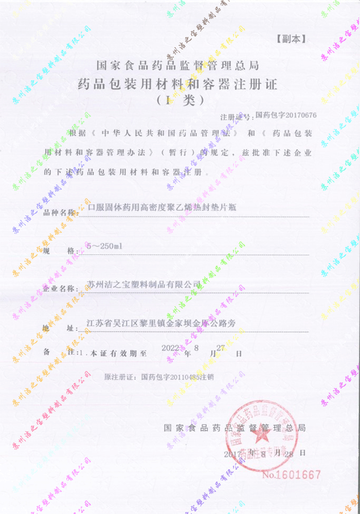 口服固體藥用高密度聚乙烯熱封墊片瓶注冊(cè)證